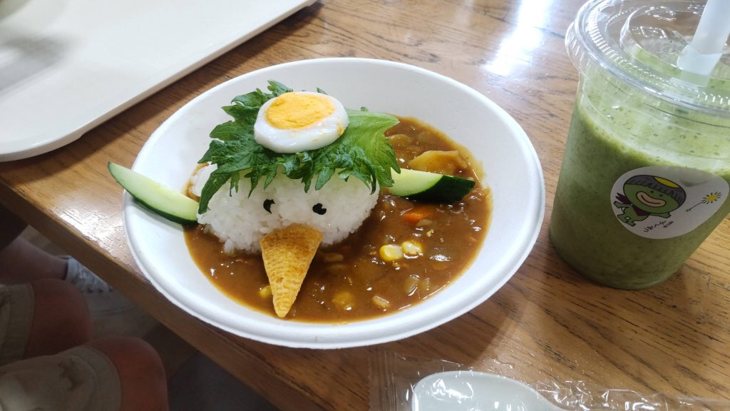 南砺の逸品であるなんとポークや地元の野菜をふんだんに使用した「かっぱカレー」は、味はもちろんのこと、シソの葉やキュウリ、ゆで卵などでかっぱの顔をデザインしたユニークでかわいい見た目も好評を博し、用意した約50食が2時間ほどで売り切れました。