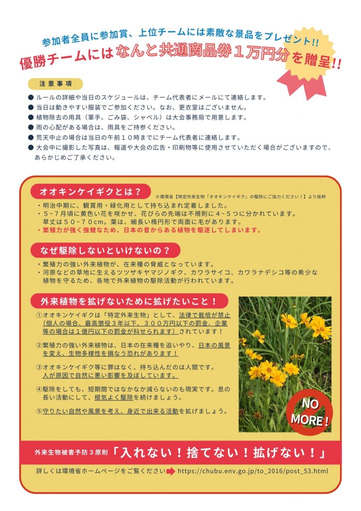 このイベントは、制限時間内にチームで協力して外来植物「オオキンケイギク」を取り除き、その除去の丁寧さや量でポイントを競い合います。子どもから大人まで楽しめる内容で、親子で自然保護に取り組む貴重な機会です。みなさまのご参加をお待ちしております!