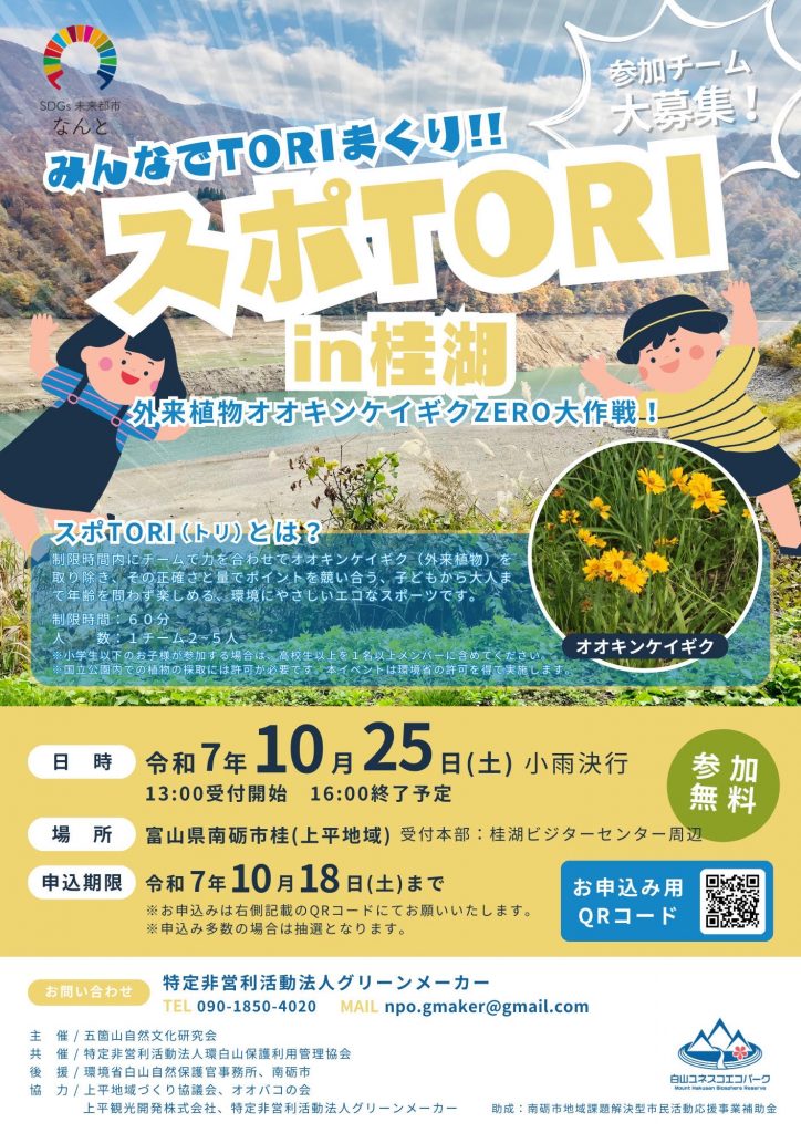 白山国立公園にある桂湖で開催される環境保護イベント「スポTORIin桂湖~外来植物オオキンケイギクZERO大作戦~」についてお知らせします。