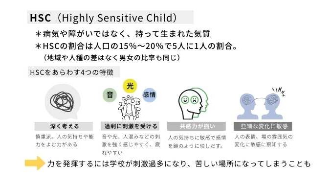 HSCは子どもの約5人に1人が該当するとされており、繊細な特性ゆえに公立学校の環境が負担となり、学校生活を続けることが難しくなる場合があります。