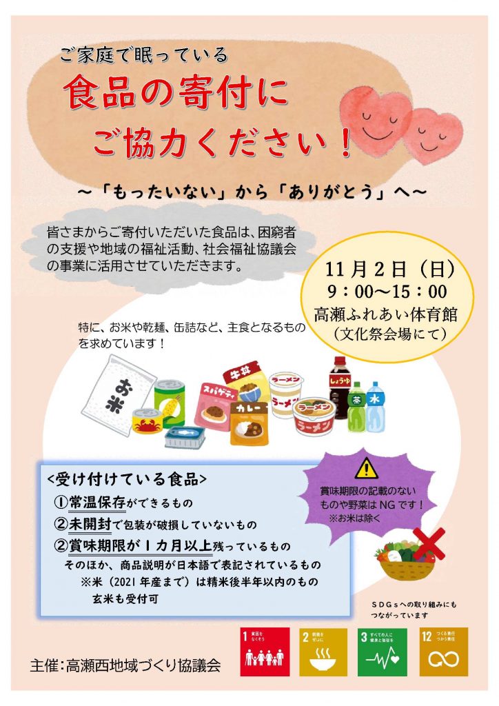 令和7年11月2日(日)高瀬ふれあい体育館(文化祭会場)において、フードドライブが実施されます。