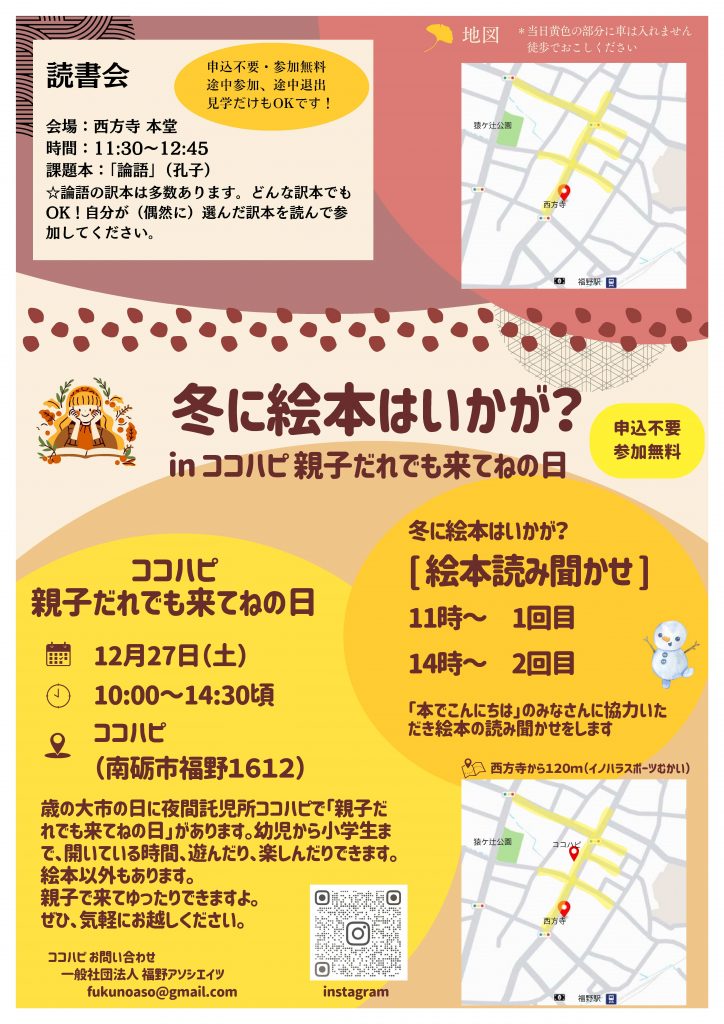 西方寺から徒歩すぐのココハピでは、お子様向けの遊び場や絵本の読み聞かせを開催!親子で一緒に本の世界を楽しみませんか?